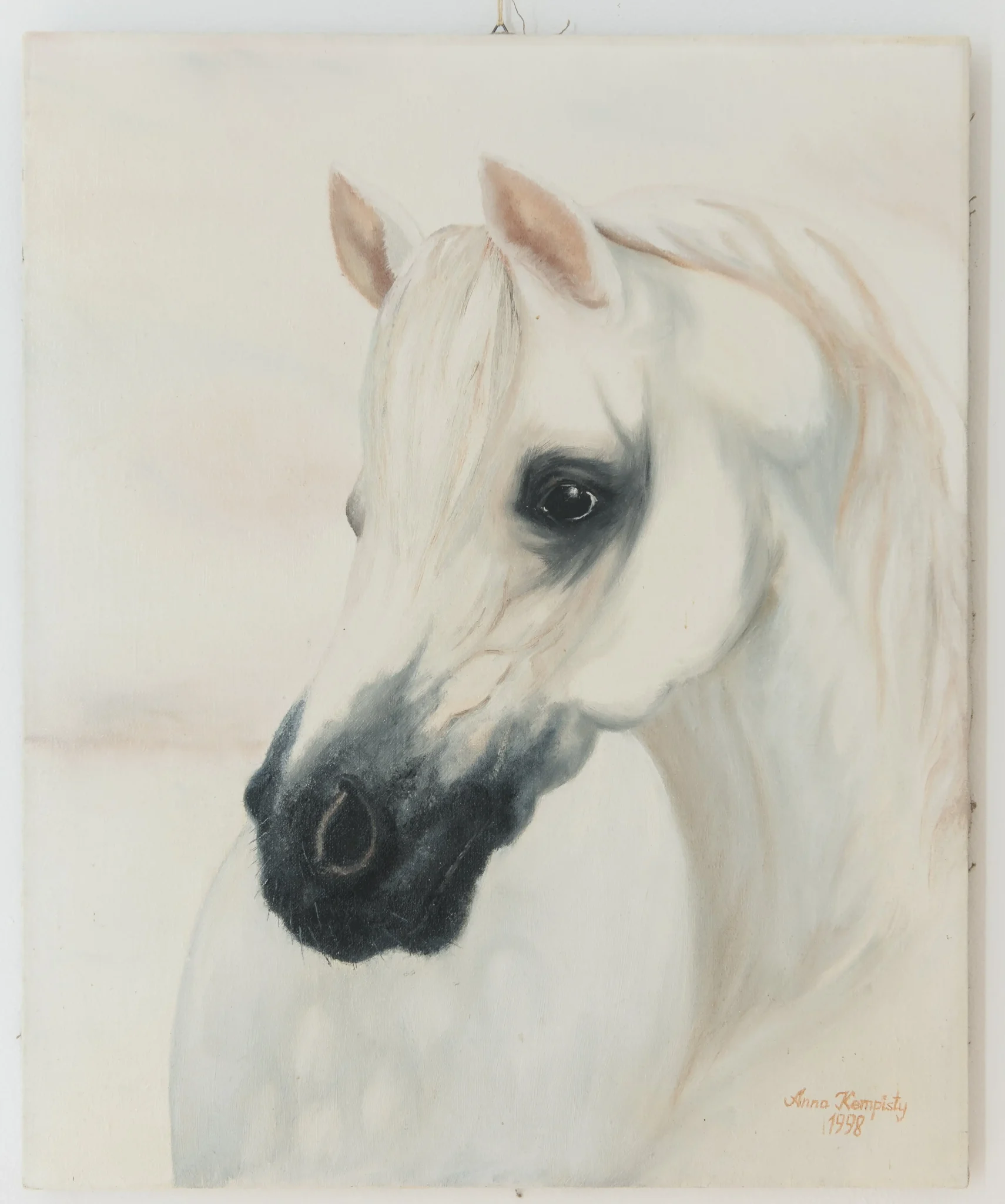 Delikatna, niemal eteryczna sylwetka konia i jedno, czujne oko – jakby coś widziało więcej niż my. Spokój na powierzchni, ale pod nim napięcie, siła i instynkt. To dokładnie ten rodzaj energii, który zmienia zwykłą ścianę w punkt skupienia całego wnętrza.